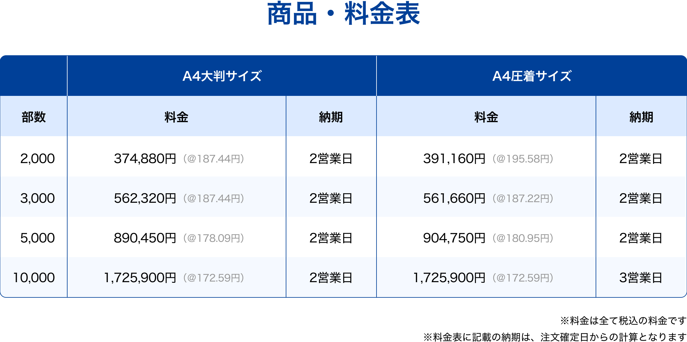 ・料金表記載の営業日は、印刷発注から発送までの納期となります。・原稿の審査/宛名リスト抽出も含めまして、問合せから発送まで約2~3週間を目安としております。